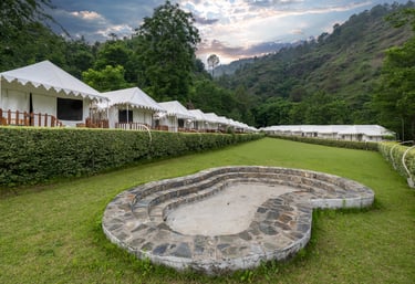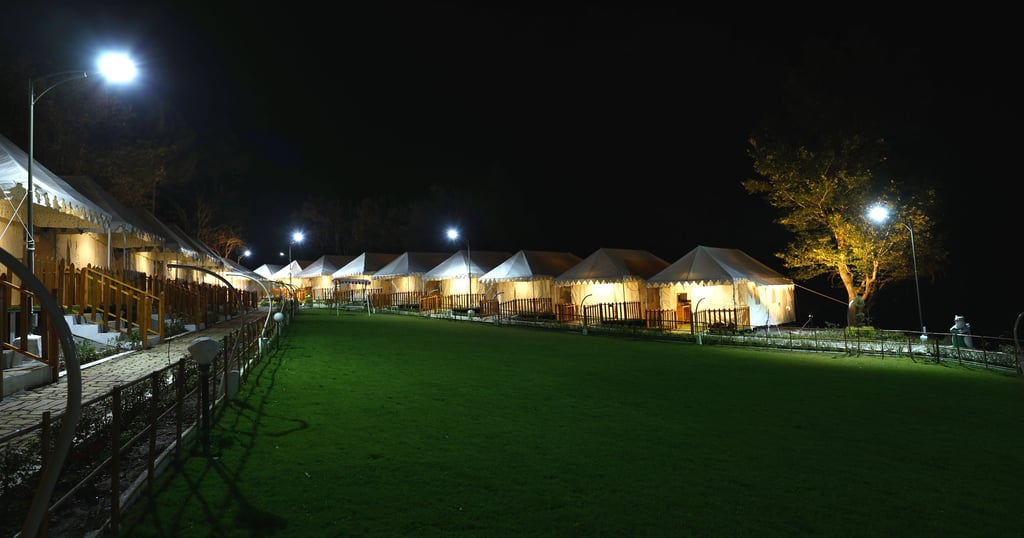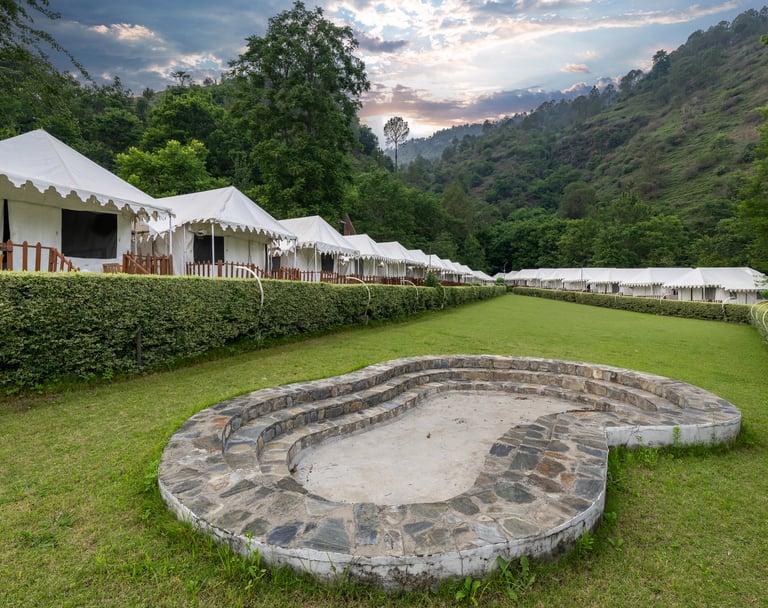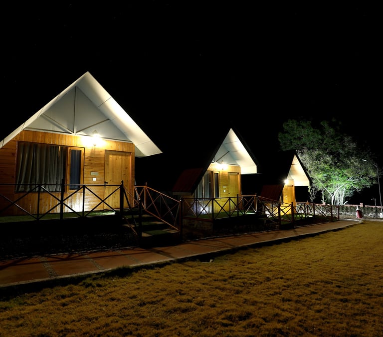 Experience premium wooden cottages and luxury Swiss tents, complemented by cozy bonfire evenings, open green lawns, and peaceful forest surroundings in Sadhupul near Chail.