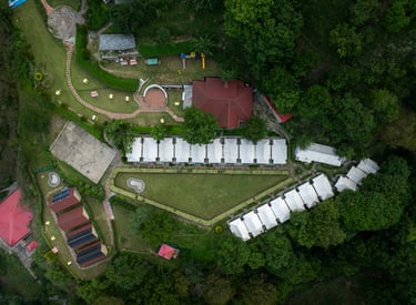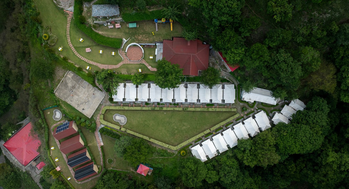 Nestled in Sadhupul near Chail, Niyama Jungle Resort features premium wooden cottages and Swiss tents surrounded by pine forests, wide open green lawns, and breathtaking valley views.